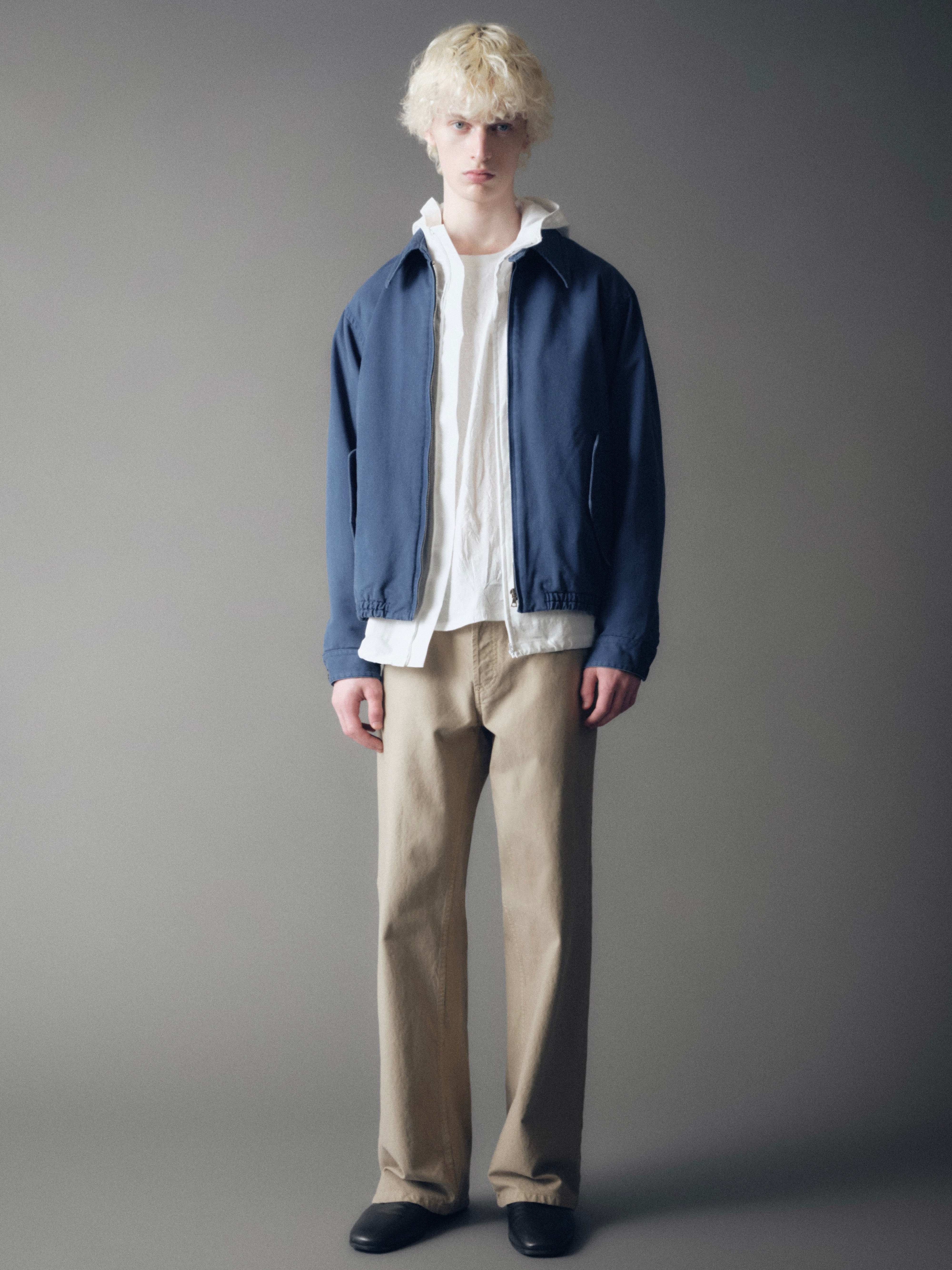 Garment-dyed drizzler Jacket in cotton and cashmere with snap button flap pockets, elasticated hem, and chin strap with zipper and button closure. Crafted from enzyme-washed cotton, the fabric offers a distinctive, softly brushed hand and a lived in look. It is lined in custom cotton cashmere blend plaid fabric.